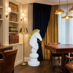Artistic and fun the life size chess pieces are light weight and durable. Constructed in fiberglass the set of statues can be used indoors or out. Each piece is given a handpainted finish that makes them look so real no one will know. A knight always protect his king and with this pair he’ll always be able too. Please avoid direct sunlight to protect the handpainted finish. For long periods of outdoor exposure we recommend sealing the pieces with a clearcoat.