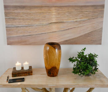 Handmade, the rich teak wood shows natural grains and imperfections complimenting the sleek contemporary design of the vase. The natural grain and characteristics of the teak are exquisite making each vase unique in their own way. Once the high gloss finish is applied, the wood comes to life in rich color and clean design. Youll appreciate the quality of the solid wood construction as you find different ways to style the vase in your space.
