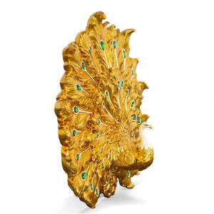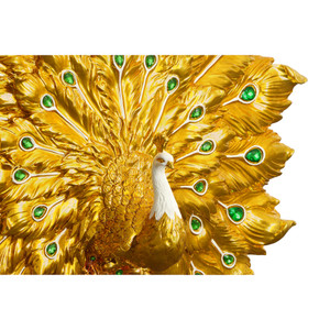 The European Elegance Golden Emerald Grand Peacock Wall Décor is a designer piece that makes a bold statement. This sculpted wall panel showcases a majestic peacock with its tail feathers raised behind it, finished in captivating gold. The tail feathers are adorned with green rhinestone crystal accents, adding a touch of opulence and drama to the design. With its dramatic scale and exquisite craftsmanship, this wall décor is sure to captivate and impress. Elevate your decor with the allure of European elegance and let this stunning peacock wall panel become a captivating focal point that adds sophistication and beauty to any space. Perfect for showcasing your refined taste and love for art in your home or office.