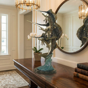 Three Sword Fish in Special Patina on Marble measuring 14 inches wide X 7 inches deep x 21 inches tall. A beautiful display piece for any marine sculpture Collector or big game fisherman. The sculpture depicts a school of Swordfish supported by a natural wave on black marble. A Marine natural sculpture featuring a new beautiful Enamel, Polychrome Finishing Technique, capturing the magical beauty and vibrant colors of our underwater world, ocean enthusiasts love this entire and expansive collection from The Timeless Creations Collections, a division of AFD Home. It is 100 percent Lost Wax Cast Bronze; a display mounted on a Black Marble Base. This item is both decorative as well as a collectible. Quality pieces of this nature last forever and can be grouped with other offerings available to create an entire Marine display. Hand Cast and Hand Finished in Thailand by skilled foundry Artists. No Assembly Require