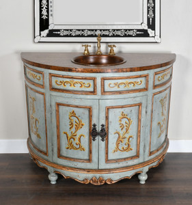 The exquisite Peruvian Copper Top Vanity in the Serena finish, a captivating piece from the Santa Lucia Collection that marries functionality with artistic craftsmanship. This 48-inch wide single-bowl vanity brings a splash of color and charm to your bathroom, featuring a unique blend of light and dark blues, complemented by painted detailed accents and a distressed finish, evoking the serene beauty of the ocean. Crafted with meticulous attention to detail, this vanity is designed for both beauty and ease of installation. It comes equipped with a mounted hand-hammered copper top and bowl, which not only adds an element of rustic elegance but also ensures durability. Pre-drilled holes for faucets and an intelligently designed opening at the back facilitate easy plumbing hook-ups, making this vanity as practical as it is beautiful. The Serena finish, exclusive to the Santa Lucia Collection, showcases a variety of blue tones that evoke a sense of calm and sophistication, making this vanity a standout piece in any bathroom. The hand-painted scrolls and distressed finish lend an air of antique charm, perfectly complementing the vanity’s overall design. Ideal for both large master baths (consider pairing two for a symmetrical setup) this piece is a versatile choice that adds character to any bathroom. Each vanity is handcrafted by skilled artisans in Lima, Peru, who employ furniture-making techniques passed down through generations, ensuring that your piece is not only a functional fixture but also a timeless investment. Part of a collection that values environmental consciousness, the Peruvian Copper Top Vanity utilizes re-purposed woods from haciendas and old colonial homes, as well as indigenous South American woods like mahogany, cedar, moena, and requiem. If your decor style leans towards the beautifully painted, rustic romantic, or you cherish the richness of Mediterranean influences, the Serena finish Peruvian Copper Top Vanity will undoubtedly captivate your heart and elevate your bathroom’s aesthetic.