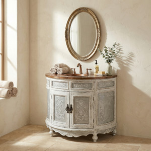 The Peruvian Copper Top Vanity in the Cabo Blanco finish from the esteemed Santa Lucia Collection, a piece that exudes charm and elegance in a beautiful distressed white finish. This 48-inch wide single-bowl vanity combines functionality with artistic craftsmanship, making it a perfect addition to any bathroom seeking a touch of timeless beauty. Crafted with meticulous attention to detail, the vanity features a hand-hammered copper top and bowl, which beautifully complement the distressed Cabo Blanco finish. The vanity’s pre-drilled holes for faucets and a thoughtfully designed back with an opening for easy plumbing hook-ups ensure both convenience and style go hand in hand. The Cabo Blanco finish lends the bathroom vanity a serene and inviting aura, with its distressed white tones offering a versatile backdrop for a variety of decor styles. Whether you’re aiming for a rustic, romantic, or Mediterranean-inspired ambiance, this vanity adapts seamlessly, enhancing the overall aesthetic of your space. Part of the Santa Lucia Collection, this vanity is handcrafted and hand-painted by skilled artisans in Lima, Peru, who employ furniture-making techniques influenced by Spanish colonial artistry. The commitment to using re-purposed woods and indigenous South American materials not only makes each piece environmentally friendly but also imbues it with a unique history and character. Whether used as a standalone statement piece in a smaller bathroom or paired with a second vanity for a grand master bath, the Peruvian Copper Top Vanity in the Cabo Blanco finish is a timeless investment that offers both luxury and heritage, sure to be cherished for years to come.