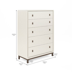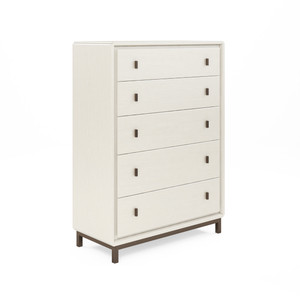 Inspired by a mix of artful elegance and contemporary style, this five drawer chest presents a chic aesthetic that elevates the daily dressing experience. Its sleek modern lines are perfectly complemented by a luxurious warm alabaster finish and a hint of contrast from the burnished bronze vertical drawer pulls and lower frame, with bottom drawers lined in aromatic cedar.
