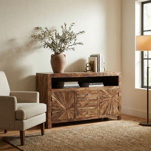 Mango Wood Solid Parquet Media Sideboard 65 Inches. Hand made imported cabinet and part of the beautiful Mango Wood Solid Parquet Collection. The unit offers versatility in placement and use. The collection has many offerings for your selection such as a Bedrooms, Dining, Living rooms and more. Solid Mango hardwoods are used to create the beautiful artistic parquet design. Naturally finished with a satin sheen that protects and enhances the wood. The grain of the Mango Wood offers beautiful variations of natural color with rich depth and tone. Hand Made and Hand Finished in India for AFD Home. No Assembly Required.