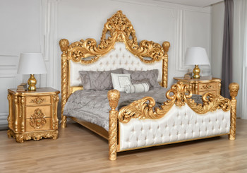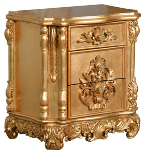 - Enhance your bedroom’s elegance with the Grand Carved 3 Drawer Nightstand, a piece that marries functionality with exquisite artistry. This nightstand features detailed carvings that exemplify the height of skilled craftsmanship, each one meticulously handcrafted by master artisans who specialize in heavy and intricate designs. The nightstand boasts three spacious drawers, providing ample storage space for your bedside essentials while maintaining a sophisticated aesthetic. Its grandeur is further accentuated by a refined finishing process, which imbues the piece with a sense of depth and character, making it a standout addition to any bedroom setting. Ideal as a companion to the Gold Grand Carved King Bed or as a standalone piece, this nightstand brings a touch of opulence and luxury to your sleeping quarters. Its detailed carvings, substantial storage, and robust construction not only serve practical purposes but also add a decorative flourish, transforming your bedroom into a space of grandiose elegance. Whether you’re aiming to complete a lavish bedroom ensemble or simply seeking a piece that combines beauty with utility, the Grand Carved 3 Drawer Nightstand is a choice that promises to elevate your decor with its unparalleled craftsmanship and majestic allure.