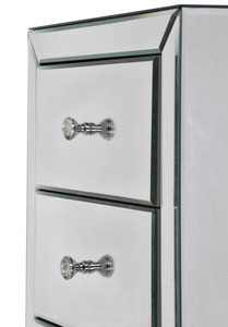 Modern sophistication and functional design, perfect for adding a touch of luxury to any room. With its fully mirrored surface, this piece reflects light beautifully, creating a sense of space and brightness. The sleek lines and polished edges bring a contemporary feel, making it an ideal addition to bedrooms as a nightstand or living spaces as a chic end table. Each of the three drawers is adorned with elegant crystal-like knobs, adding a subtle sparkle and easy access to ample storage. Whether you need to stow away bedside essentials or keep living room clutter under control, this chest combines style with practicality. Crafted with high-quality materials and durable construction, this piece not only elevates your décor but is built to last.