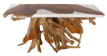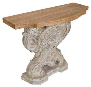This console table marries the rustic beauty of natural wood with the ornate detailing of classical sculpture. The table’s surface, a plank of warm-toned wood, sits atop a base that is a work of art in itself?robust and richly carved with acanthus leaves and curvilinear motifs, finished in a distressed style to suggest the grace of age. The dual nature of this table?a simple top contrasted with a complex foundation?makes it a versatile piece for homes that celebrate both the pastoral and the refined. It can serve as a dramatic entryway statement, a distinctive surface in a living room, or a functional piece in a dining area. This console table is not just a furnishing but a conversation piece, offering a unique blend of functionality and aesthetic appeal. It’s designed to catch the eye and hold attention, anchoring a space with its undeniable presence and craftsmanship.