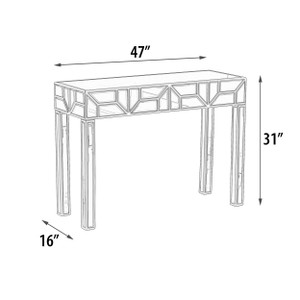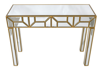 A striking statement piece that combines Art Deco-inspired design with modern sophistication. Perfectly suited for a variety of settings, this versatile console table works beautifully behind a sofa, in a hallway, or as a stylish entryway accent. Its sleek mirrored surfaces, framed with geometric gold detailing, create a sense of luxury and glamour while reflecting light to brighten any room. Crafted with precision, the angular mirrored panels on the tabletop and legs are set within a gold-finished framework, evoking a sense of refined elegance. The slim, elongated profile makes it ideal for narrow spaces, while its sturdy construction ensures durability. Whether you’re using it to display décor, a statement lamp, or as a functional surface for keys and essentials, this console table blends practicality with a stunning visual presence.