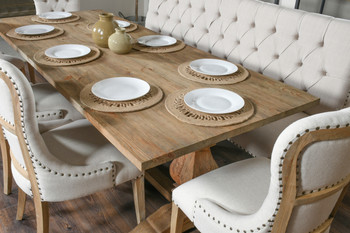 The Inverness Farmhouse Rectangular Dining Table is a full size of 95 long x 39 deep x 31 inches table height. It is hand made using Authentic Reclaimed New Zealand Pine. The finish and style are very appropriate for the period of this design. The item is hand made and also Bench Made, finely crafted furniture that will last with reasonable care, made one piece at a time. The wood used is Reclaimed wood imported from New Zealand; it is old repurposed wood rescued from old barns, houses, barns, boxcars, and wine barrels. Wood that is highly prized for the authentic seasoned effects and age old character. It is environmentally good to repurpose the wood and an essential part of the authentic look and quality of our new American Farmhouse and or our Coastal Series from the Heritage Collection, a division of AFD Home. The Series is an expanding collection with lots of affordable, purely fashioned furnishings offerings befitting a more relaxed American lifestyle. Consider ordering the complete dining set with bench and chairs or matching this table with any of the beautiful farmhouse collections of chairs that will work equally. Complete your room by adding one of the matching sideboards, buffets, or consoles. All of the Farmhouse / Coastal Series pairs perfectly with each other and can be mixed matched and combined to increase the desired interior design. Hand Made and imported from Indonesia. Minor assembly of attaching the top to base and legs required. Perfect for a rustic, coastal, or farmhouse style interior. Handcrafted in Imported Authentic New Zealand Pine Reclaimed wood rescued and repurposed wood from old barns, houses, barn, boxcars, and wine barrels. Wood that is highly prized for the authentic seasoned effects and age old character. It is a part of a popular new American Farmhouse and or our Coastal Series from the Heritage Collection. The Series is an expanding series that is affordable yet appropriately fashioned for a more relaxed lifestyle.