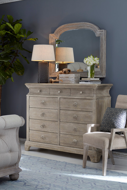 The natural beauty of cathedral-sawn flaky oak takes center stage in the exquisitely crafted eleven-drawer Light Keeper?s Dresser. From top to bottom the dresser is rich with artisanal details: cove molding around the top and base; a concave upper box banded with chevron carving; and wooden pegs on the bracket feet. The scrubbed finish serves to open up the wood and brings out the beauty of the grain