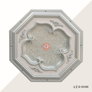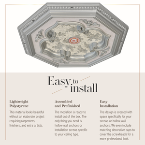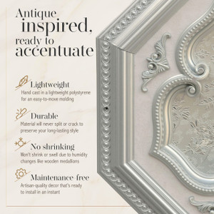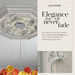 Light weight and easy to install the medallion. Measures 24 inches in diameter. Features an elegant finish of white on silver background in the shape of a four leaf clover.