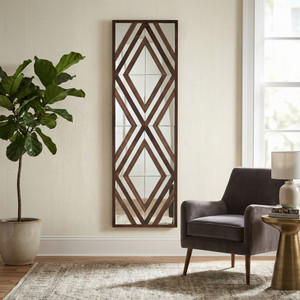 The Modern Aspen Double Diamond 74 inches Mirror measures 21.25 inches X 1.5 inches X 72.50 inches. The Aspen Series of mirrors is a contemporary collection of styles using diamond shapes and accent strips of mirror to create its stunning designs. The finish is dark wood stains creating a beautiful and dramatic finished effect. The finish and design combine to create a spectacular new mirror design that would be an immediate focal point. The creation is more than a simple mirror; it transcends into the category of wall art and offers a natural organic and contemporary feeling. The mirror comes with hanging hooks installed to allow either a vertical or horizontal wall installation. This Wall Art Mirror is another functional work of art by Timeless Reflections inches Makers of the Finest Quality Beveled Mirrors inches a division of AFD Home. No Assembly required
