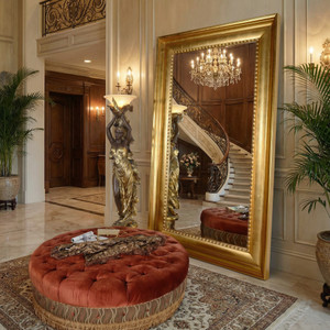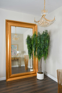 BUYER BEWARE ** The Mammoth Wood Mirror with Gold Leaf Finishing is one of the largest solid wood Mirrors available. This Mirror creates a major statement of Clean yet Massive Grandeur. Perfect for Commercial Applications in need of Spectacular. It is made in solid wood and finished by hand with stunning hand applied Gold Metal Leaf finishing. Gold finishing one of the popular finishes available on this large profile which is also offered in Silver leaf or Seasoned Wood. While this huge mirror is popular for simply floor leaning use, Hangers are installed for hanging but caution should be taken in doing so and make sure to secure into solid framing. The Biggest and the Best from Timeless Creations ” Makers of America’s Finest Decorative Mirrors” a division of AFD Home