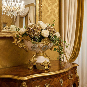 The Celine Collection is one of the most beautiful traditional designed accessory groups. The Celine Crowned centerpiece measures 19.1 inches wide x 7.1 inches deep x 12 inches tall. The Hand finishing is elegant, offering a subtle contrast of white, blue, silver, and gold. Versatile as a centerpiece for an arrangement or as a decorative object. Sold separately but often used with a pair of Celine Crowned Urns to create a complete table or mantel set.