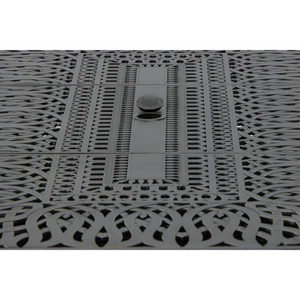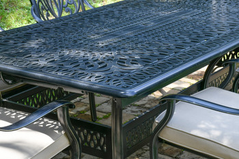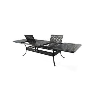 The Outdoor Estate Dining Extension Table is the finest table from Bridgeton Moore Patio. Especially for settings were big is required and flexibility is even better. The table comes with 2 separately operating butterfly leaf’s that allow the table to go from 84 Inches (7 Feet) with no leaf’s open to 108 or a whopping 132 Inches Long fully opened. Spaciously seating 10 adults. You will like the way the exclusive butterfly mechanism allow the leaf’s to store away under the table in the smoothest, quickest and easiest manner. The table is cast in All Weather Aluminum and will not rust. The table is offered in a Ebony tone finish with soft silver toned dry brushed accents. Powder coat sealing protect the finish for longest lasting outdoor use. This table is often ordered with the matching chairs consider either the Sku # 12011080 Outdoor Estate Dining Arm Chair and nicely combined with the Sku # 12011082 the Outdoor Estate Dining Swivel Arm Chair.