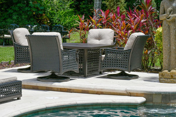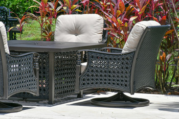 One of the most desirable sets in the market. Popular for its function and it’s luxurious and beautiful Styling. A set that will surely become the favorite gathering spot of anyone’s outdoor entertaining. The Monterey 5pc Outdoor Club Chair Set w Propane Fire Pit Table, 4 Swivel Rocking Chairs Bridgeton Moore, Patio, Furniture, Aluminum, Woven, Sumbrella Fabric Whether your entertaining friends or enjoying a quiet evening in the backyard with family you will enjoy the relaxing deep-seating with dual motion swivel and rocking chair features while enjoying the night and the light of your fire. The Monterey 5-piece Propane Fire Pit Table and Chair Set features quality construction for years of enjoyment with minimal maintenance. • Aluminum Construction, will not rust • Welded framing, less assembly and greater structural integrity • Sunbrella All Weather Cushion Covers over quick drying cushions. • Synthetic Weave Upgrade * Propane Table With Easy Glide Tank Holder (Tank Not Included) ^ Easily Accessible Ignition And Propane Volume Knob Set Sku : 12012440 Includes: Sku : 12008199 qty 1- Low propane fire pit table with built in tank holder (tank not included), ignition switch, volume control knob, and decorative lava rocks. Sku : 12012477 qty 4- Deep Seating Dual Motion Swivel Rocking Chairs with all-weather patented Sunbrella Cushion Covers The Monterey Design brings interior styling Outdoors. The collection is all hand woven over 100 % Aluminum frames that will never rust. The weave itself is an upgrade synthetic weave with a rich touch and appearance. The weave allows for expansion and contraction in different climates and is the best on the market. A fine collection styled around the beauty of interior furniture but manufactured in a quality to create, the best long lasting outdoor patio furniture. The Monterey Collection is one of the newest and largest collections offered by Bridgeton Moore with many wonderful options to complete any type of project, From Dining to seating options, with lots of cool sets and matching items to consider. Constructed using todays Best in Class manufacturing techniques, Bridgeton Moore has established high brand quality standards and offers one of the best warranties in the Industry, 3 years on all frames and finish under normal conditions, fabrics are all Sumbrella grade and come with a manufacturers supplied two years against any manufacturing defects and or fading from date of purchase. Note * All products used outdoors require reasonable care and that level of care depends on varying external conditions. Covers are recommended for year round outdoor exposure and especially for all coastal applications. Extended exposure in coastal areas can cause corrosion and while this product is used in many coastal applications, they are voided from warranty. Simple hosing down or rinsing off salt exposure if/any will protect and extend the beautiful finish. The fabrics can be easily cleaned in a variety of ways and Sumbrella fabrics are so colorfast they can withstand even the use of bleach. Assembly Required.
