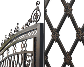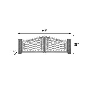 The Bridgeton Moore Aluminum Estate Entry Gate and Fencing Collection offers an Elegant Design. It is an investment in a quality that adds value to your property and makes your home more beautiful and secure. It is also, the only complete estate system of its kind, cast in Aluminum, a system that will never rust. This particular item is the Bridgeton Moore Complete Wide Driveway Entry Gate System 242 Inches Wide, dimensions from outer edge of post to post are 242″ wide 16 deep X 85″ tall providing a 220 ( 18) wide opening. Designed and cast in 100% aluminum that will never rust requiring little to no assembly. The finish is a rich brown bronzed tone with hand brushed highlights that accent the details and then a long lasting double powder coat finish is applied, making this the longest lasting, lowest maintenance, easiest to install, turn-key system in the market for any price. Comprised of a left and a right gate which comes pre-mounted to their respective posts each with a pre-mounted welded wheel for smooth operation and the posts where designed to mount easily to the provided mounting spike. Owners, installers and especially do it yourselfers will love the ease of installation that the systems design and provided mounting spike offers making the installation of such a beautiful gate system as easy as banging the spikes into the ground and then just bolting the post to it, the bottom of post and the top of the mounting spike have pre-drilled holes that will align with each other for bolting down. Note * If the location of installation does not offer a solid soil or for those simply wishing a more permanent installation floating and leveling the mounting spike first into a 16 square or round x 30 deep concrete form is advised once hardened you can then bolt the post to the spike ( when leveling your mounting spike leave enough room above the concrete for connecting your bolts, you can fill in this gap with anything appropriate to match the area after connections are made. The decorative scrolls on top of the gates are shipped separately for safety and need to be simply attached. The Bridgeton Moore Estate System is a traditional and exclusive collection of beautiful Driveway and Entry Gates, Fencing, Railings, Posts and Lights cast in 100 % Aluminum. Bridgeton Moore has taken 10 years of developing and evolving this to be the finest most complete system in the market and finally replacing what was only previously available in cast Iron. This intricate level of design and this complete of a collection had never before been available in Aluminum. It required a upfront multi-million dollar investment in giant die cut steel molds to cast the first gate, but now Bridgeton Moore can precision cast each piece efficiently and in their entirety. Aluminum is the best metal for outdoor use 1) .. It doesnt rust 2) ..The finished product is 1/3 rd lighter in weight then iron, especially important when developing a gate that can be installed easily and operates over long periods of time off hinges and on wheels and 3) . Will create significant less resistance in the long term use when installing a remote controlled gate opener ( sold separately). For centuries Iron casting was used and while it never could be cast as clean or with the same crispness of details, Iron did provide a customer looking for a beautiful gate the only option. Iron castings are achieved through an inexpensive sand mold process a very efficient process for creating an item which will only be cast in small quantities, Iron costs 28 times less then Aluminum at todays 4 cents a pound versus aluminum at $1.15. And while the ability to create the beautiful design is comparable that is where the comparison ends. Iron weighs 3 times what aluminum does, making the installation of a large driveway gate like this require installation costs usually double the cost of the gate itself with the Bridgeton Moore Estate System the gate is already pre-hung on the post and you can easily install it yourself 2) Iron rusts and Bridgeton Moore System never rusts 3) Iron requires frequent painting for protection and with the Bridgeton Moore Estate System not for a long time. The decision is easy and with this complete system you can add on and expand now or in the future, Bridgeton Moore offers several sizes of fence options, posts and lanterns. Our customer service associates are knowledgeable and available to help with your ordering. Bridgeton Moore has established high brand quality standards and offers one of the best warranties in the Industry, 3 years on all frames and finish under normal conditions, against any manufacturing defects from date of purchase. Note * All products used outdoors require reasonable care and that level of care depends on varying external conditions. Extended exposure in coastal areas can cause corrosion and while this product is used in many coastal applications, they are voided from warranty. Simple hosing down or rinsing off salt exposure if/any will protect and extend the beautiful finish.