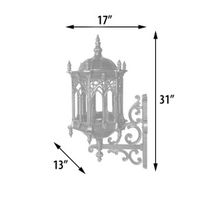 The 13 wide x 31 inches tall Gothic Wall Sconce with its scale, style and elegance is one of the finest sconces available in the market. With fantastic details of spires, scrolls and archways surrounding the glass light enclosure. The design is architecturally pleasing for many styles of Mediterranean, traditional and western style homes. The item is suitable for exterior use as it is cast 100 percent in aluminum. The finish is a hand applied antique gold finish with hand brushed accent tones defining the detail and comes with a 2 year manufacturers warranty against defects to the frame or finish. Aluminum is the preferred metal for outdoor use. The item is wired for direct connection to a standard electrical junction box and all wiring and light components are UL listed. Bulb is not included but the light uses a standard E27 26 bulb up to 60 watts. Consider combining with our other Gothic outdoor collection for a more complete themed design application. All outdoor products require maintenance depending on the environment.