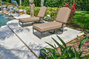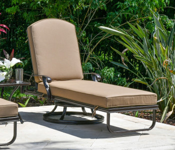 Introducing the groundbreaking Savannah Swivel Chaise Lounge by Bridgeton Moore, a revolutionary addition to outdoor comfort. This chaise lounge redefines luxury and relaxation, offering a haven of tranquility in your outdoor retreat. Featuring an exclusive 360-degree swivel base, this lounge provides effortless adjustment for optimal comfort without the need to reposition the entire chaise. Simply rotate to find your perfect lounging position, whether basking in solitude or enjoying company. Each chaise boasts a stunning bent, forged, and hand-hammered scroll design, finished in a rich bronzed tone with brown highlights, enhancing its timeless elegance. Constructed entirely in aluminum with a powder-coated finish, these lounges ensure enduring beauty and functionality. Welded for durability, the swivel chaise lounges guarantee stability and enjoyment for years to come in any outdoor setting. Special quick-drying cushion cores, upholstered in Sunbrella fabric, offer both comfort and durability. Sunbrella fabrics are UV resistant and colorfast, allowing for easy removal and washing, ensuring vibrant fabric for years of enjoyment. Backed by Bridgeton Moore’s high-quality standards and a 3-year warranty on all frames and finishes, this investment is built to last. For maintenance, we recommend covers for year-round outdoor exposure and keeping the furniture surface clean of debris to protect the finish. Experience outdoor living at its finest with the Savannah Swivel Chaise Lounge, where craftsmanship, durability, and style converge seamlessly.