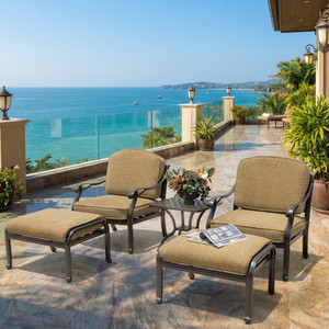 - Bridgeton Moore presents the Outdoor Savannah 5 Piece Club Chair Set comes complete with 2 Club Chairs, 2 Ottomans and a Side Table. This popular Club Chair set was designed for deep seating comfort in a style that is both beautiful and Timeless. The Savannah is a large Collection and offers many other accompanying items enabling you to expand and create your entire outdoor area is this Classic Life Style Collection., a classic collection featuring a woven lattice design and a brown bronzed powder coat finish. All offerings are hand cast in 100% aluminum and will never rust. The Chairs come fully constructed, meaning they are fully welded prior to finishing, the best process to insure long lasting heavy duty stability and require no assembly. The cushions are special quick drying foam and covered with a soft beige Sumbrella Brand fabric, considered amongst the best fabric for long lasting outdoor use in the industry. The table requires light assembly. Set Sku: 11232253 Set of 5 Includes Sku: 11232085 Savannah Outdoor Club Chair Qty 2 28.93 x 30.90 x 31.69 Sku: 11232034 Savannah Outdoor Ottoman Qty 2 24.13 x 27.71 x 16.14 Sku: 10636512 Savannah Outdoor Side Table Qty 1 Constructed using todays Best in Class manufacturing techniques, Bridgeton Moore has established high brand quality standards and offers one of the best warranties in the Industry, 3 years on all frames and finish under normal conditions, fabrics are all Sumbrella grade and come with a manufacturers supplied two years against any manufacturing defects and or fading from date of purchase. Note * All products used outdoors require reasonable care and that level of care depends on varying external conditions. Covers are recommended for year round outdoor exposure and especially for all coastal applications. Extended exposure in coastal areas can cause corrosion and while this product is used in many coastal applications, they are voided from warranty. Simple hosing down or rinsing off salt exposure if/any will protect and extend the beautiful finish. The fabrics can be easily cleaned in a variety of ways and Sumbrella fabrics are so colorfast they can withstand even the use of bleach. No Assembly Required!