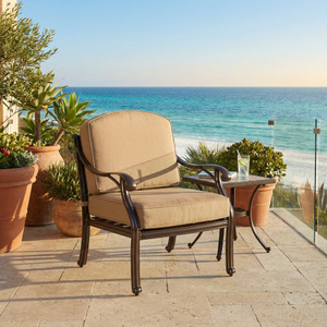 - Bridgeton Moore presents the Outdoor Savannah Club Chair, a deep seating chair with plush seat and back cushions in Sumbrella. The Savannah is a large Collection and offers many other accompanying items enabling you to expand and create your entire outdoor area is this Classic Life Style Collection., a classic collection featuring a woven lattice design and a brown bronzed powder coat finish. The chair is cast in 100% aluminum and will never rust. The chair comes fully constructed, meaning it is fully welded prior to finishing, the best process to insure long lasting heavy duty stability and requiring no assembly. The chair cushions use a special quick drying foam and covered with a soft beige Sumbrella Brand fabric, considered amongst the best fabric for long lasting outdoor use in the industry. The Savannah Collection offers the Savannah Ottoman which pairs nicely with these club chairs for an extended and more relaxing seating combination as well as many other accompanying items for you to consider, enabling you to expand and create your entire outdoor area is this Classic Southern Life Style Collection. The chair comes fully assembled. Bridgeton Moore has established high quality brand standards and offers one of the best warranties in the Industry, 3 years on all frames and finish under normal conditions, fabrics are all Sumbrella grade and come with a manufacturers supplied two years against any manufacturing defects and or fading from date of purchase. Note * All products used outdoors require reasonable care and that level of care depends on varying external conditions. Covers are recommended for year round outdoor exposure and especially for all coastal applications. Extended exposure in coastal areas can cause corrosion and while this product is used in many coastal applications, they are voided from warranty. Simple hosing down or rinsing off salt exposure if/any will protect and extend the beautiful finish. The fabrics can be easily cleaned in a variety of ways and Sumbrella fabrics are so colorfast they can withstand even the use of bleach.