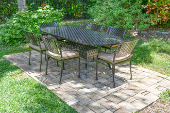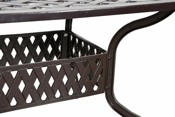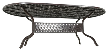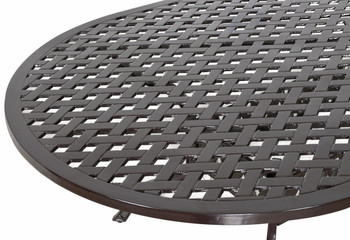 Bridgeton Moore presents the Outdoor Savannah Oval Dining Table, a nicely sized larger table that comfortably seats 8 adults. The oval dining table measures 84 Inches wide x 42 Inches deep. A style that is both beautiful and Timeless, a classic collection featuring a woven lattice design and a brown bronzed powder coat finish. The table is cast in 100% aluminum and will never rust. The Savannah Collection offers perfectly paired chairs for this table consider ordering the matching Savannah Dining Chairs. Savannah is a large beautiful Collection that offers many other accompanying items enabling you to expand and create your entire outdoor area is this Classic Life Style Collection. The table requires assembly. Constructed using todays Best in Class manufacturing techniques, Bridgeton Moore has established high brand quality standards and offers one of the best warranties in the Industry, 3 years on all frames and finish under normal conditions, fabrics are all Sumbrella grade and come with a manufacturers supplied two years against any manufacturing defects and or fading from date of purchase. Note * All products used outdoors require reasonable care and that level of care depends on varying external conditions. Covers are recommended for year round outdoor exposure and especially for all coastal applications. Extended exposure in coastal areas can cause corrosion and while this product is used in many coastal applications, they are voided from warranty. Simple hosing down or rinsing off salt exposure if/any will protect and extend the beautiful finish. The fabrics can be easily cleaned in a variety of ways and Sumbrella fabrics are so colorfast they can withstand even the use of bleach.