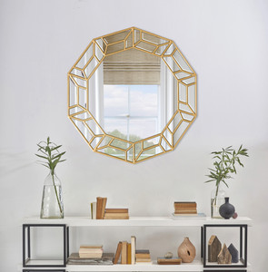 A striking wall accent that brings a touch of Art Deco flair to any room. This mirror features a unique geometric frame composed of beveled mirrored panels set within a stylish gold framework. The intricate design adds depth and dimension, creating a stunning focal point that beautifully reflects light and enhances the sense of space. With its versatile 30-inch diameter, this mirror is perfect for various settings, from entryways and living rooms to bedrooms or above a vanity. The blend of mirrored surfaces and gold detailing complements both modern and classic interiors, making it a timeless addition to your home. Hang it solo for a bold statement or incorporate it into a gallery wall for added visual interest. Wherever it’s placed, the Round Deco Mirror effortlessly elevates your space with its elegant design and radiant style.