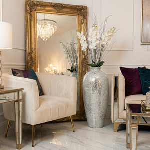 - A very popular Brilliant Nilexus Vase 32.5 Inches Tall, the vase is sized for either a floor vase application or an impressive tabletop placement. Hand cast in a very durable Polyresin and entirely coated in a Micro Mosaic Crackled Mirror covering. The design is fitting for modern to even Traditional applications were sparkle, glam, and some Bling is desired, sold separately but often ordered in pairs for balance. It also goes beautifully with the Brilliant Nixelus Mirror. No Assembly Required.
