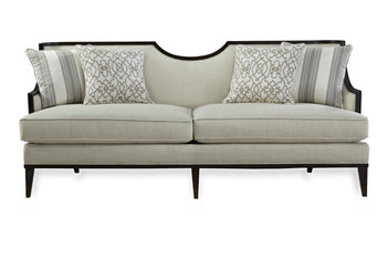 Clean and classic, the sleek Harper Sofa brings together elements of both contemporary and traditional design: square tapered wood legs, exposed wood frame, curved arms, and a reverse half moon cut out on the back. The sofa?s comfort, however, is 100 percent modern: tailored upholstered back and deck and two down-blend seat cushions, plus two pairs of down blend throw pillows. In addition to the sofa, the Harper Ivory collection includes a matching chair.