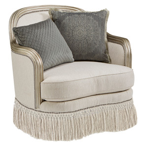 Elegantly curved along the front and the exposed-wood back and arms, the Giovanna Bezel Matching Chair is a masterpiece of old school luxe. The frame?s rich glam finish is accented with silver, and the chair is upholstered in a soft touch woven and features a down blend-filled seat cushion, hand-applied nail head trim, self welting and a deep skirt of matching bullion fringe. The chair comes with two down blend-filled toss pillows in coordinating fabric and trim.