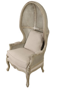The Continental Balloon Chair-PM is a 30″ wide 28″ deep x 58.5″ tall classic. The Chair features a very unique open dome design with curved styling and intricate yet delicate carved frames. The chairs feature detailed double caning, meaning the beautiful hand caning is on both sides of each section inside and out, twice the workmanship better the final quality. The seat cushions and pillows are upholstered in a continental beige linen that works beautifully with the wood frame finished in Heritage’s Parchment Multi ( PM) finish. Another exclusive design and finish from our Heritage Collection, a collection of fine, hand made furniture in the purest of standards of age old traditional crafting. Each piece is hand carved, one piece at a time, by some of the world’s best carvers. The special Mahogany wood comes from replanted forests. The selected wood has been kiln dried. The item in its final form is stress and pressure tested prior to finishing to insure long lasting stability, in most all climates, a Heritage Brand standard. The final steps of hand making quality furniture is the application of the hand-applied finishes. The Parchment Multi (PM) finish completes the beauty and value of owning timeless Heritage Furniture, a quality that will last for generations of ownership. Sold separately but often ordered in pairs, the (PM) finish offers many accompanying items that can be combined with these chairs to expand the desired interior. Made by hand and imported from Indonesia.