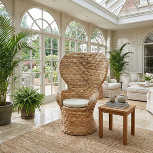 - Introducing the Rattan Cobra Chair, a striking piece of craftsmanship that celebrates the beauty of natural materials and organic design. This chair is a standout addition to any room that values unique artisanal touches and sustainable choices. Designed to make an impression, the Cobra Chair features an alluring silhouette that mimics the majestic stance of its namesake. The chair’s back curves upward and outward in a sheltering embrace, culminating in a comfortable, high-backed throne that offers privacy and solace from the bustle of daily life. Handwoven using robust water hyacinth, a fast-growing, sustainable resource, the Cobra Chair is both eco-friendly and durable. The wide weave pattern not only adds to the visual interest but also showcases the natural variations in the material, giving each chair its unique character. The natural hue of the water hyacinth brings a warm, earthy tone to any interior, complementing a variety of decors from coastal to rustic and beyond. The inclusion of a plush cushion ensures comfort is not sacrificed for style, inviting you to sink in and relax. This chair is a testament to the skill of traditional weavers, blending timeless techniques with modern aesthetics. It is perfectly suited for a sunroom, an inviting corner of a living room, or even a covered outdoor patio, where its natural vibe can harmonize with the surroundings. As practical as it is visually appealing, the Rattan Cobra Chair provides a focal point that is both grounding and uplifting, celebrating nature’s bounty and human artistry in equal measure. Add this enchanting chair to your collection and enjoy a piece that is as much a conversation starter as it is a seat.