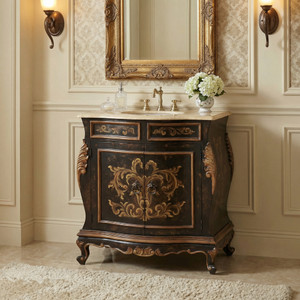 The Dorado Vanity is a 33″ wide single bowl vanity. The vanity is beautiful and decorative as well as designed to make installation as easy as possible. It comes with a mounted beige solid travertine marble top with pre-drilled holes for faucets, a mounted porcelain bowl, and the back was designed with an opening to allow for easy plumbing hook-ups. This collection boasts a Spanish influence with its large scaled details in a popular finish of deep rustic browns featuring a contrast of distressed black and delicately detailed with hand-painted soft scrolls. Consider ordering 2 for a large master bath application. The Dorado Vanity s is part of our Santa Lucia Collection consisting of handmade, hand-painted, and distressed solid wood furniture making each piece a timeless investment. Handcrafted treasures made one piece at a time, under one roof, by our exclusive family owned manufacturer from Lima, Peru. Their master artisans are skilled in furniture making techniques influenced by the Spanish during the colonization of Peru. Many items in the diverse collection feature specialty hand-painted finishes that have also been passed on and perfected from generation to generation. The family strives to be environmentally friendly by using woods re-purposed from haciendas and old colonial homes as well as wood indigenous to South American forests, primarily mahogany, cedar, moena, and require. If you are a lover of beautiful painted furniture, find hill country rustic romantic, or find richness in Mediterranean lore then you too may fall in furniture love with this fine collection.
