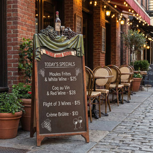 - Offering a Wine Motif decoration a top a large Chalk Board surface for marking daily specials with mounted easel stand for ease of a standing display.